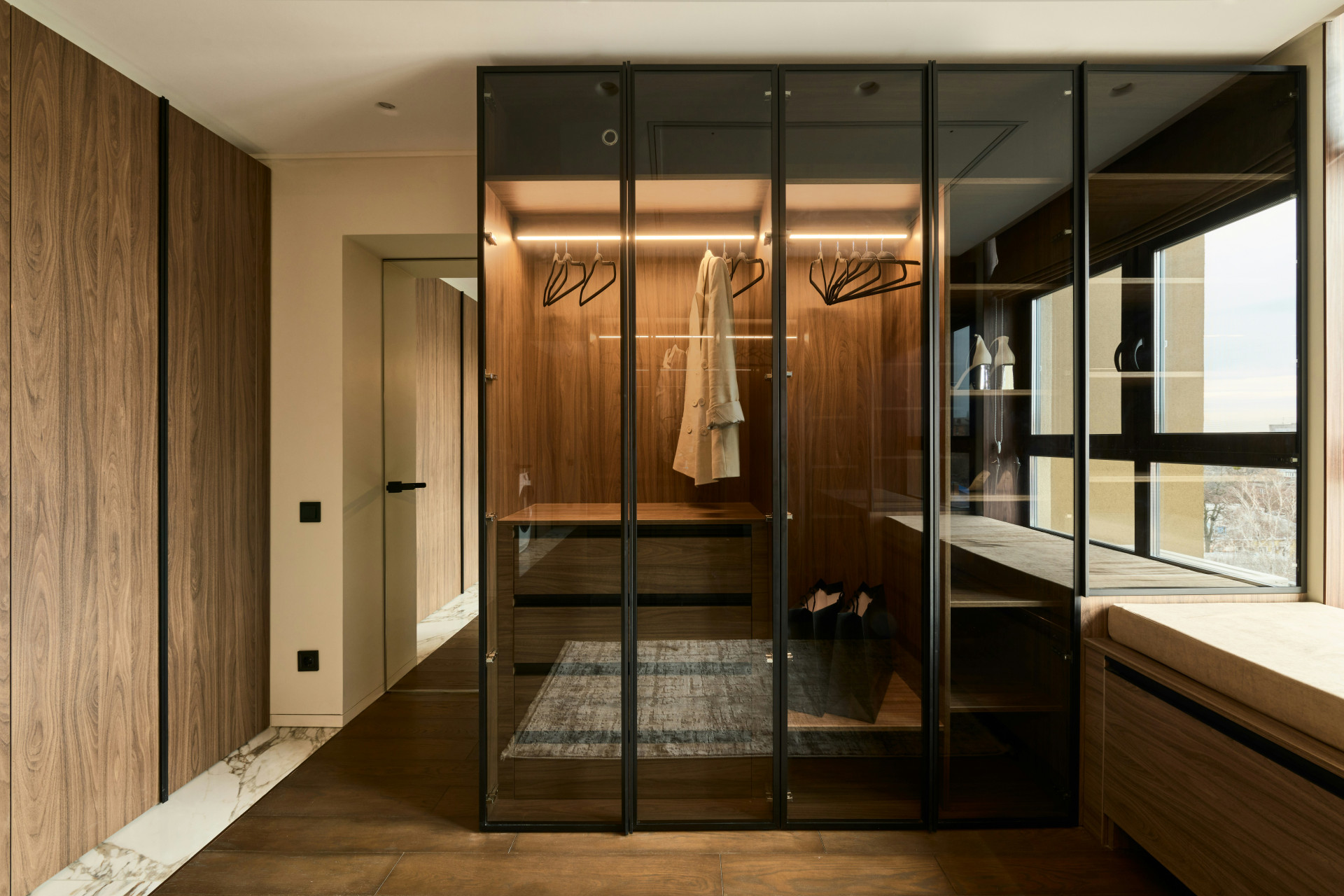 - Walk-in-vaatehuoneessa voi yhdistää avohyllyt, peilit ja istuinratkaisut ylelliseksi kokonaisuudeksi.